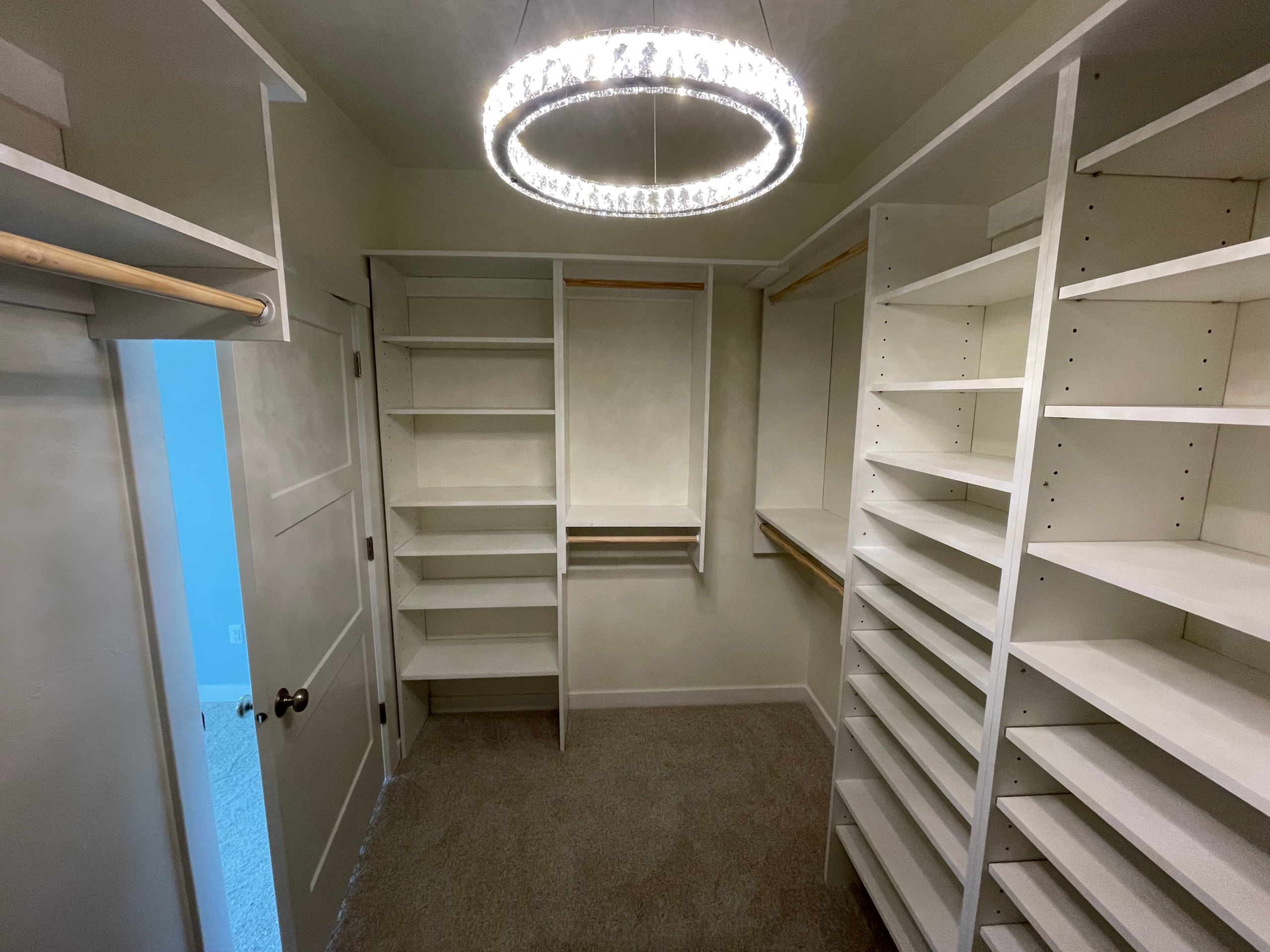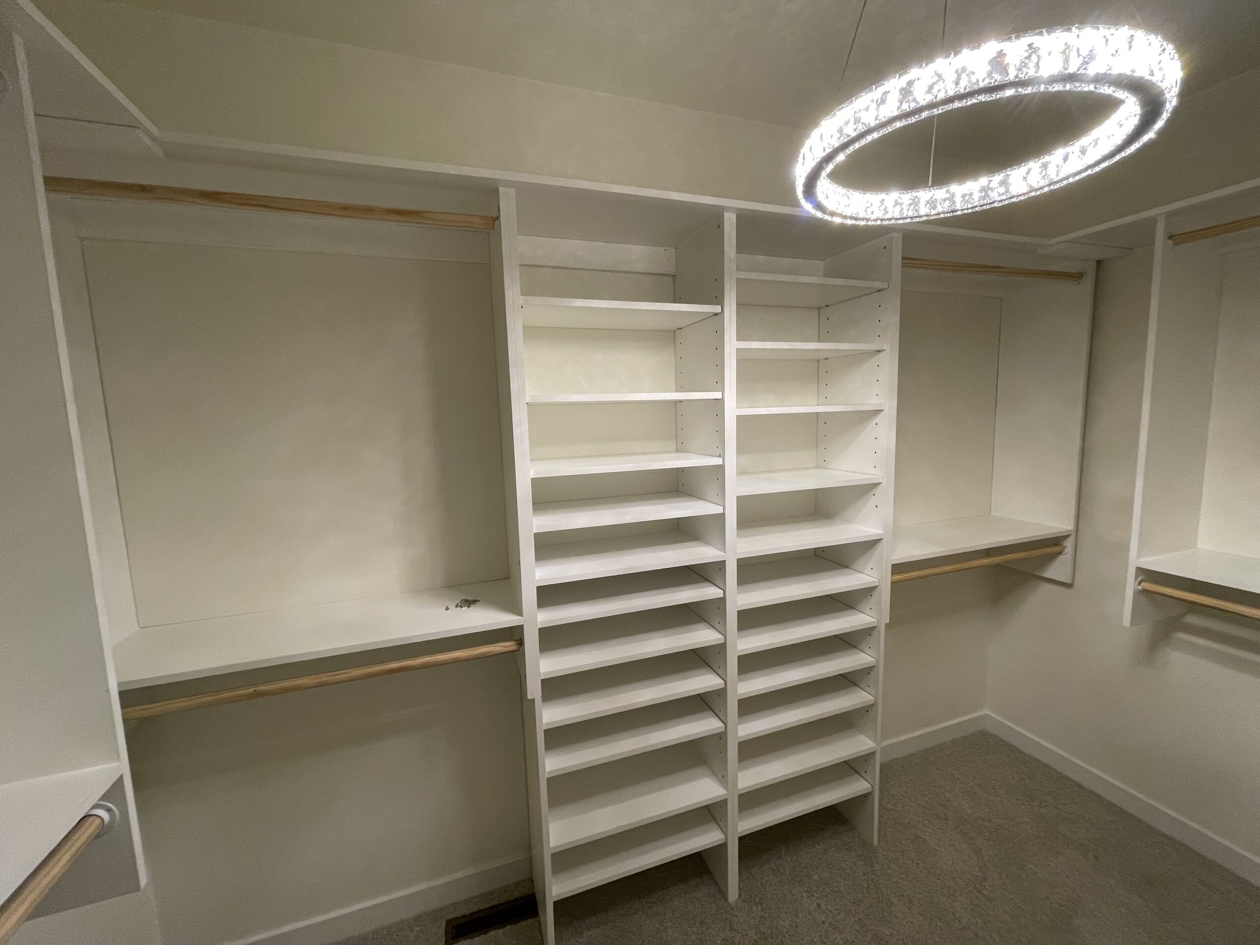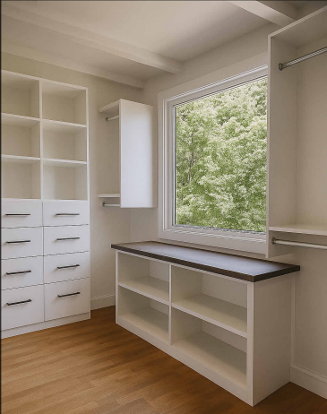 Our custom storage systems offer versatile layout options to fit your needs perfectly. Choose from single hang sections for long garments, double hang areas for shorter items, adjustable shelving for shoes and accessories, and drawers for additional organization. Each layout is designed to maximize space, keep everything accessible, and create a closet that’s both functional and beautifully tailored to your lifestyle.
