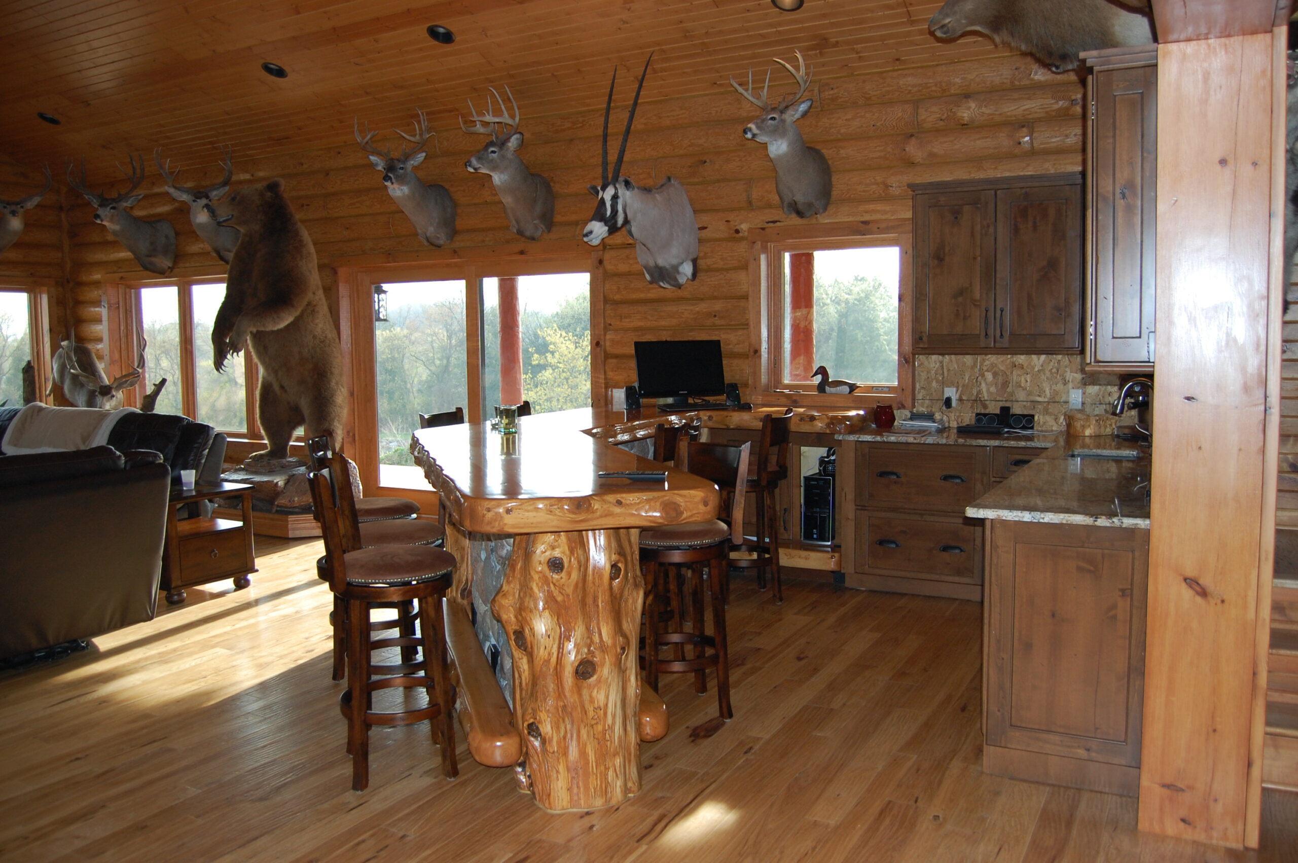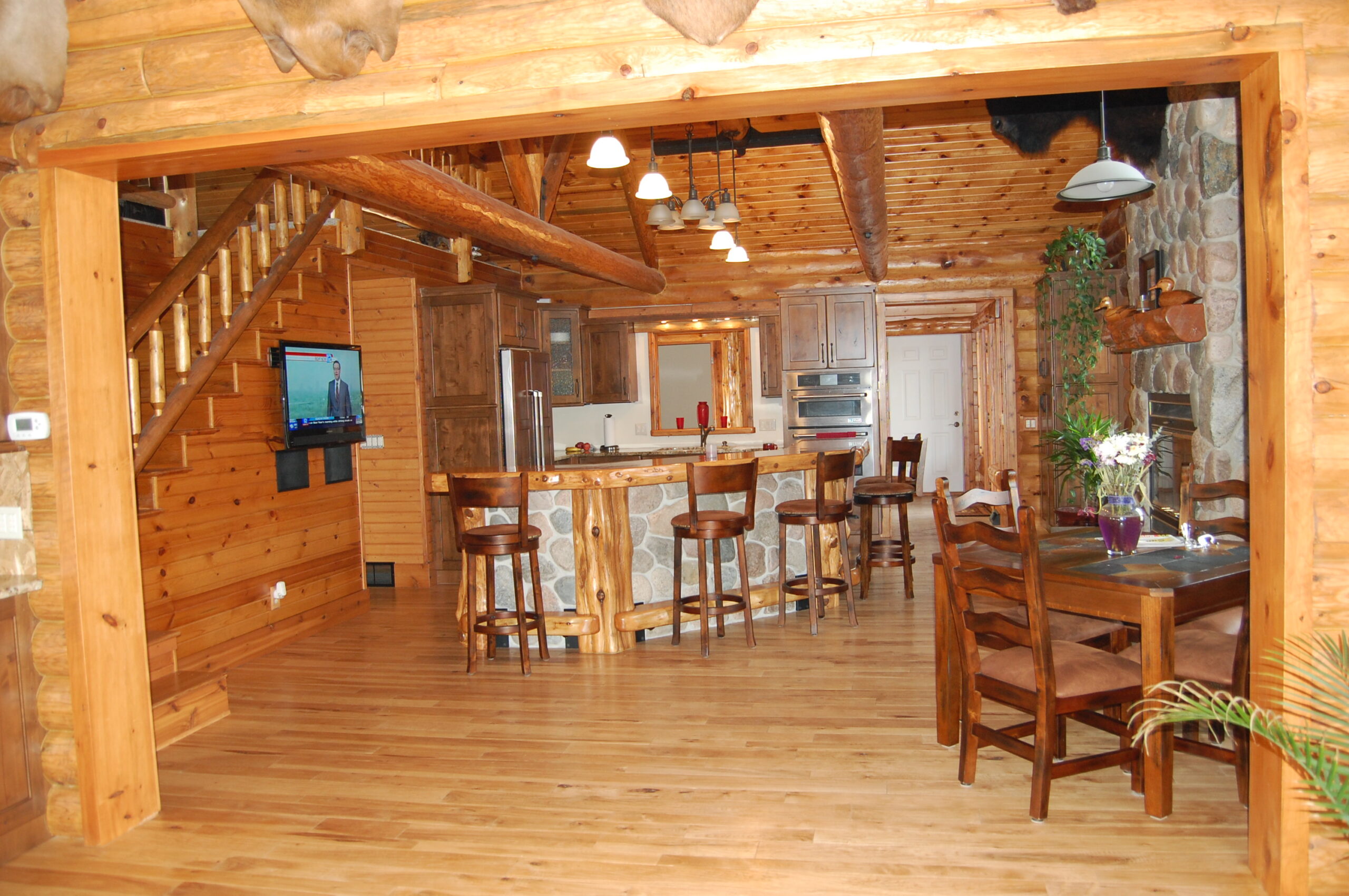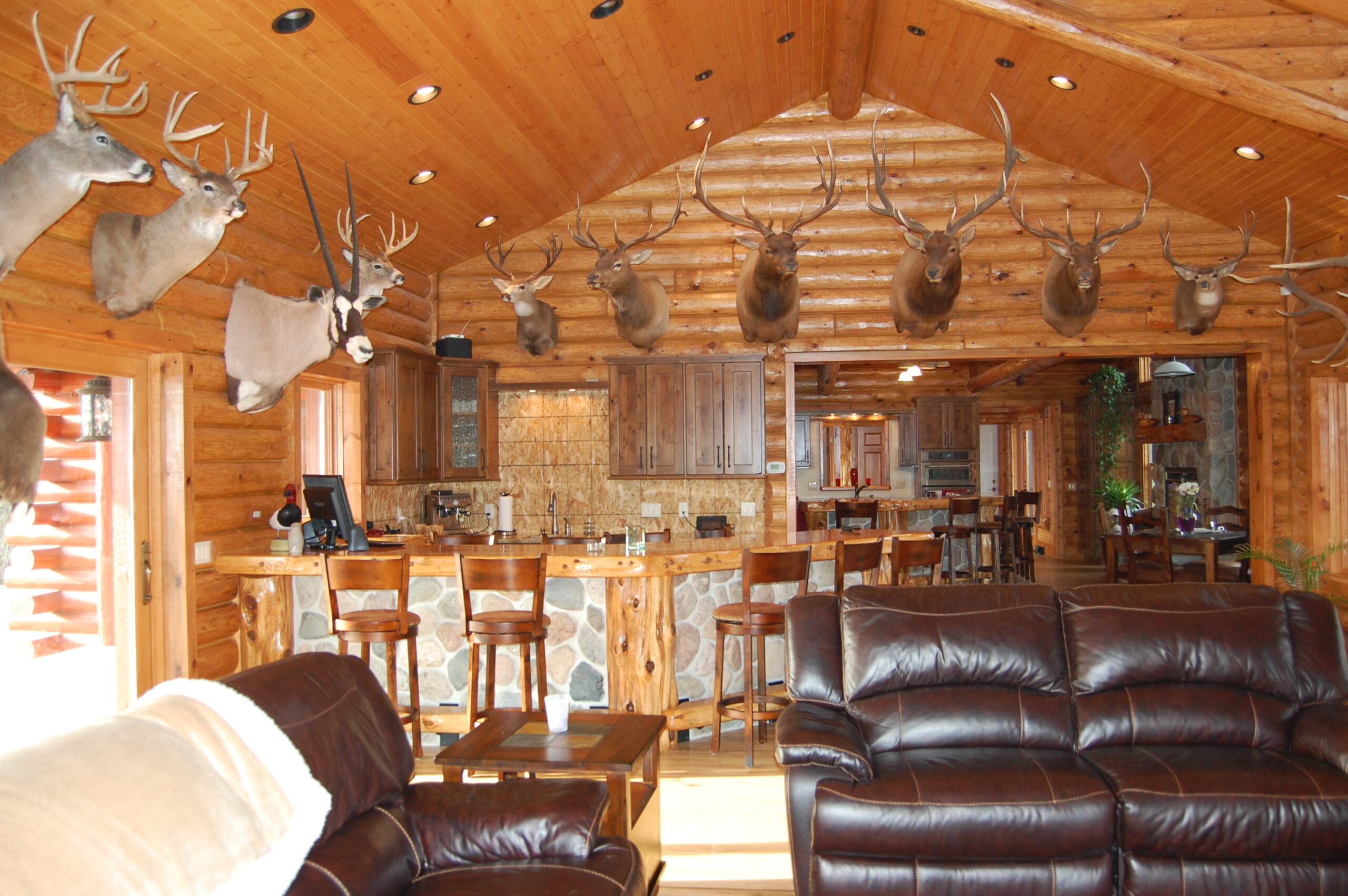 Custom stone features, custom exterior, log walls, tongue and groove ceilings, custom cabinets