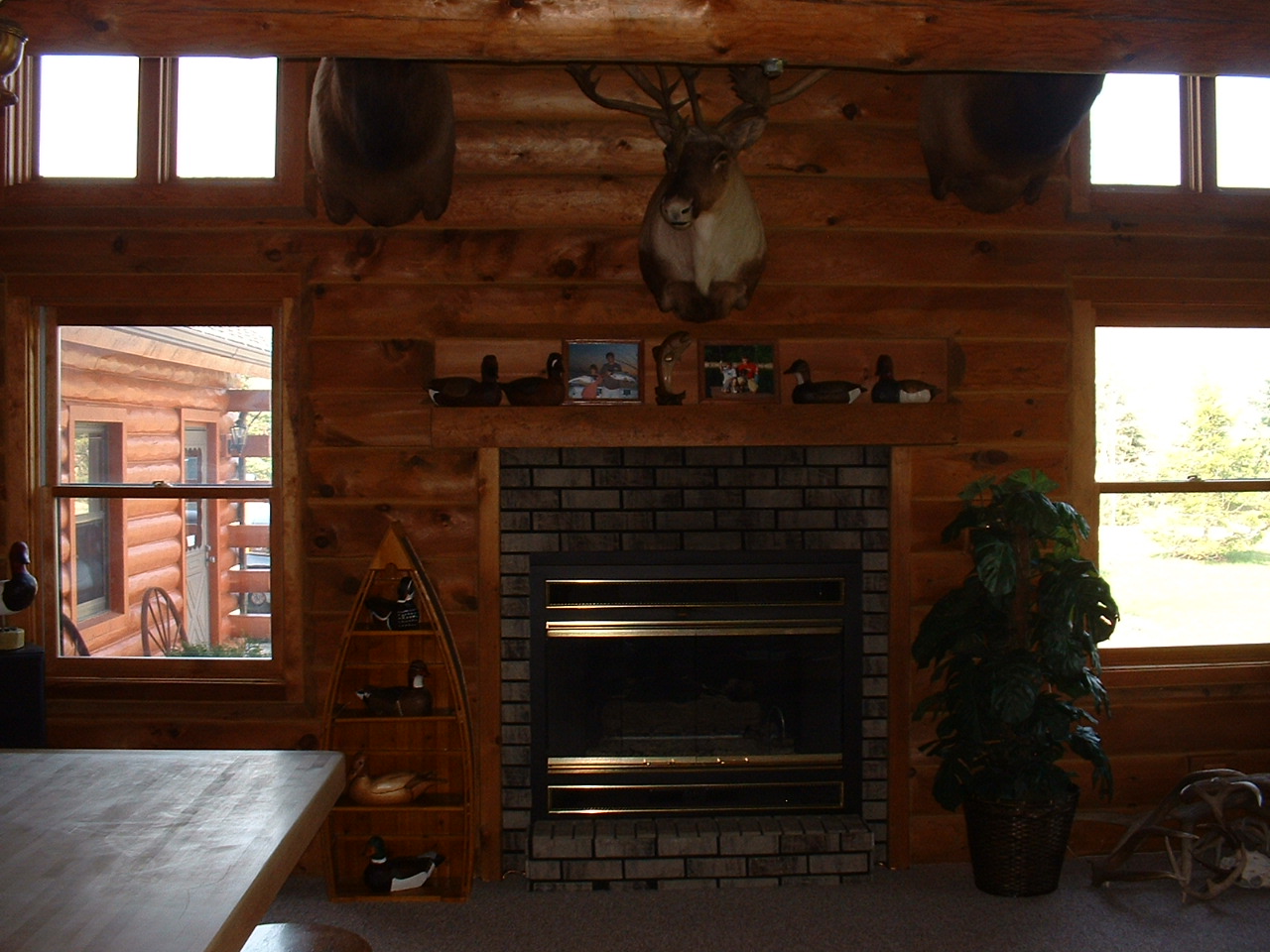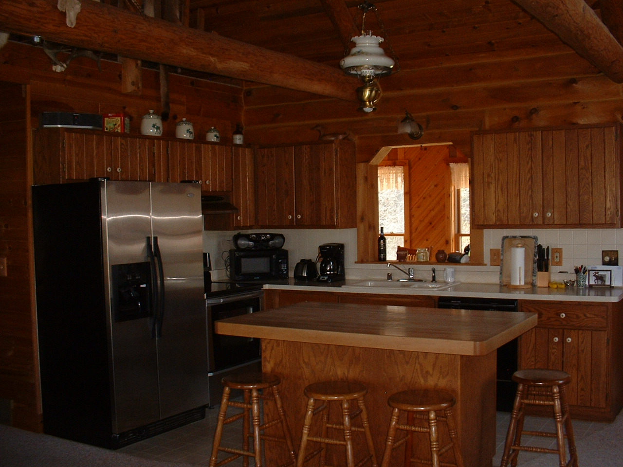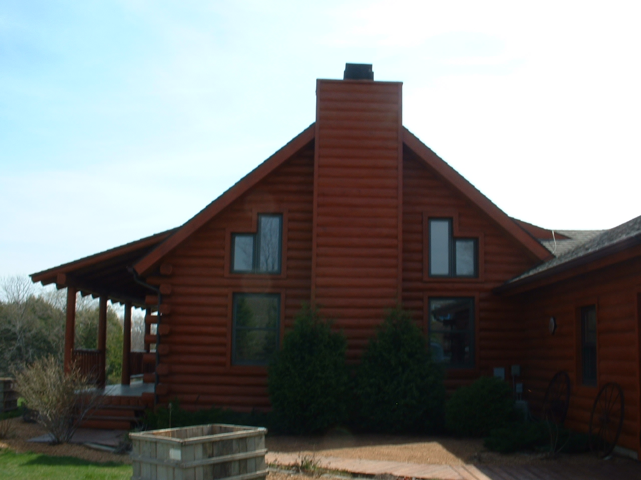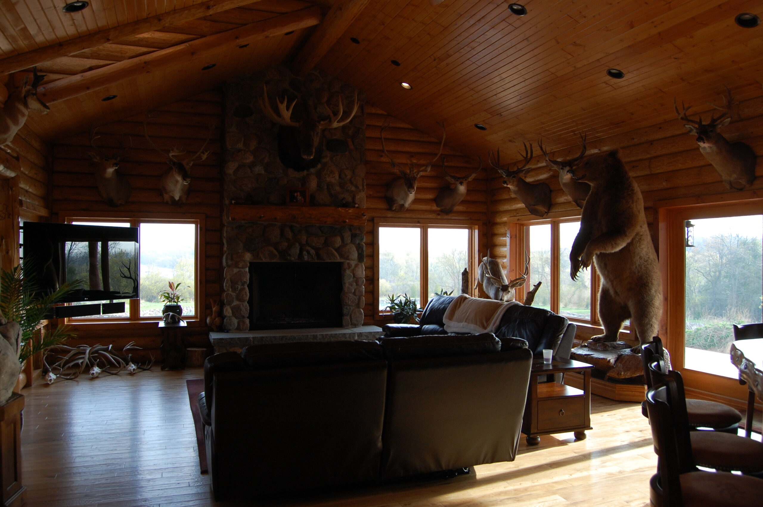 Custom stone features, custom exterior, log walls, tongue and groove ceilings, custom cabinets